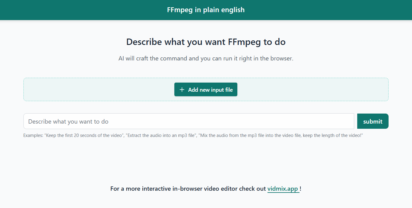Came across this useful little AI tool that combines AI and the FFmpeg Webassembly project. The tools itself is pretty simply, add a file, write a prompt of what you want to accomplish with FFmpeg and the service sends the prompt to a GPT model and returns a FFmpeg command you can run right in your browser to do run on the file you gave it. The file itself never leaves your browser from what I can see in Chrome Network Tools, the only request is te GPT call to fiquire out what you want FFmpeg to do.